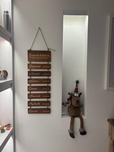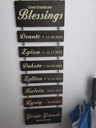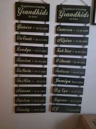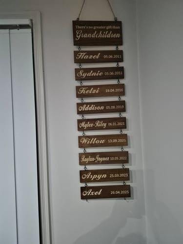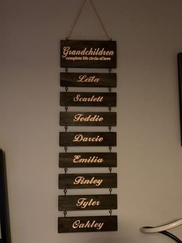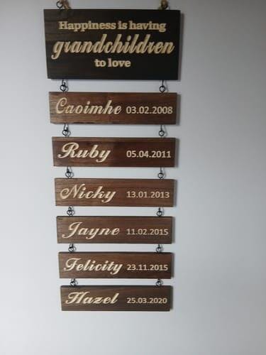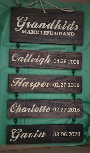 How do we make it? Each wood sign is made to order, crafted from premium pine wood, carefully cut and hand-sanded. We then apply a walnut oil-based stain ( available in 3 colors) and engrave your grandchildren's name and special date onto the wooden plaque, permanently etched. Last we add hangers and package them with care.