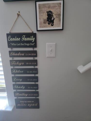 • The main sign measures 9.84" x 4.72" x 0.31" (25 x 12 x 0.8 cm), accompanied by individual name slats which are 9.84" x 2.36" x 0.31" (25 x 6 x 0.8 cm) each.