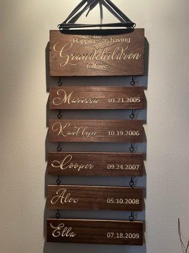 How do we make it? Each wood sign is made to order, crafted from thick premium pine wood, carefully cut and hand-sanded. We then apply a walnut oil-based stain ( available in 3 colors) and engrave your grandchildren's name and special date onto the wooden plaque, permanently etched. Last we add hangers and package them with care.