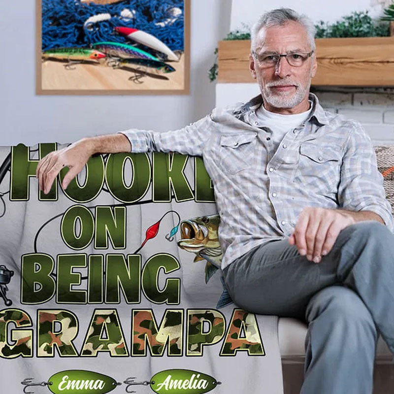 This personalized "Hooked On Being Papa" fishing-themed soft throw blanket is a gift specially designed for dad and grandpa. The warm "Hooked On Being Papa" message is printed on the throw blanket, and the customizable children's names make this gift more unique and full of emotion. Whether it is a birthday, Grandparents' Day or Father's Day gift, this throw blanket can bring warmth and happiness to dad and grandpa.