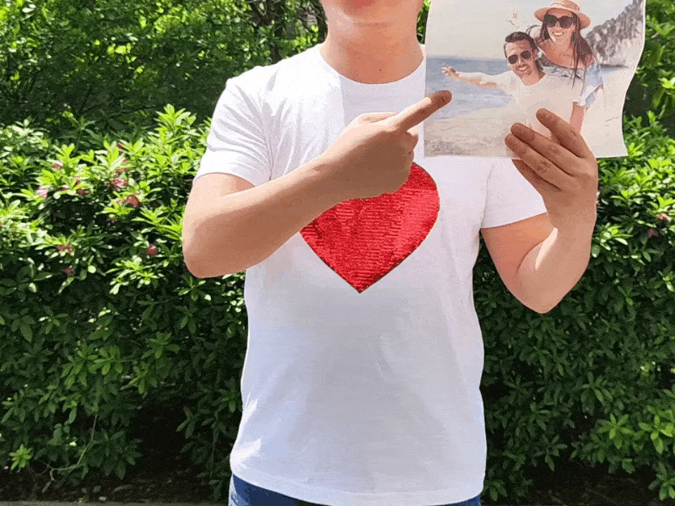 💗Introducing our customizable Glitter Photo T-Shirt, a perfect addition to your wardrobe! This unique t-shirt features a dazzling heart-shaped design made of shimmering sequins. What sets it apart is that you can reveal a personalized photo by gently swiping up on the sequins, while swiping down reveals a solid glittery surface.