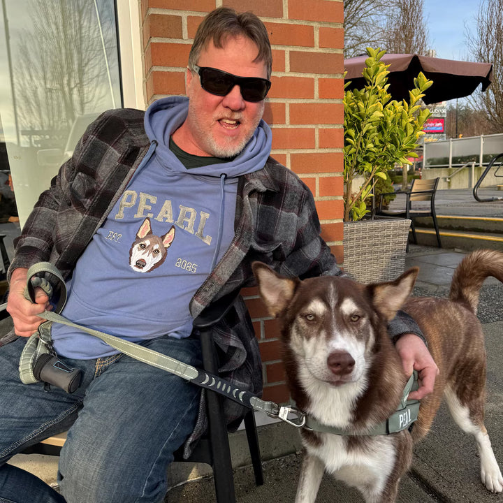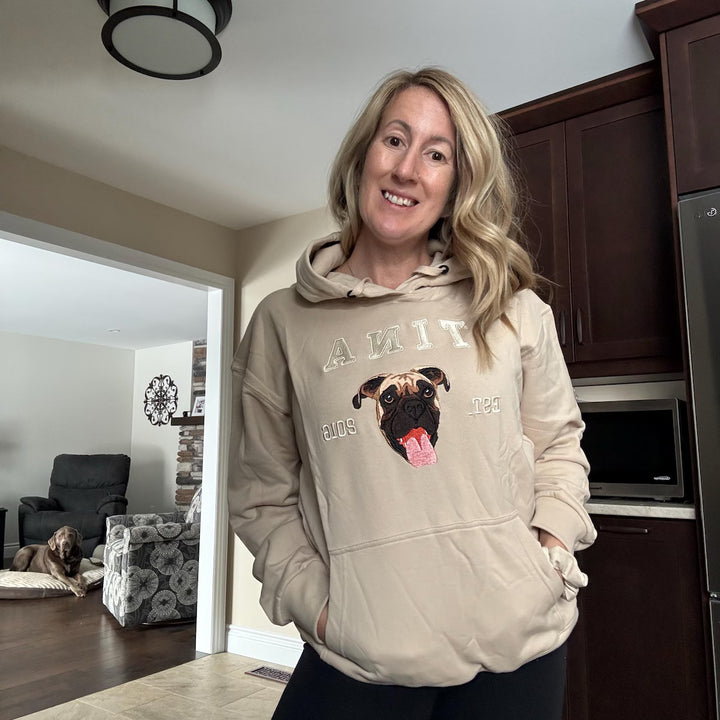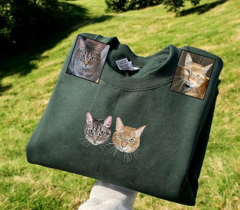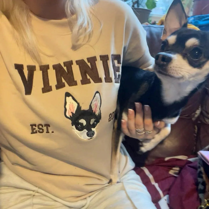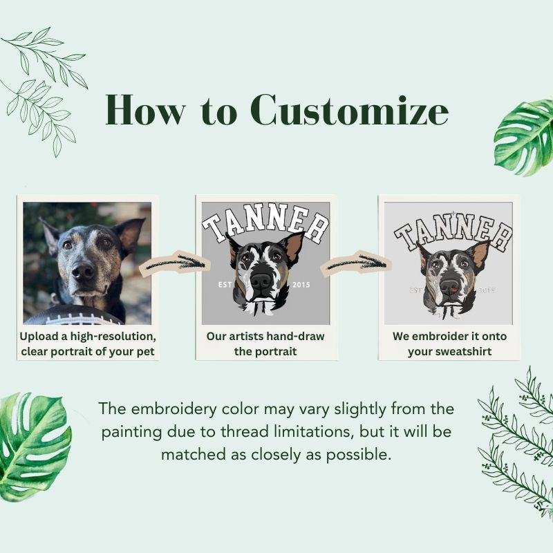 Choose the embroidery position — center or upper-left chest — and optionally add your pet’s name under the portrait or custom text on the sleeves.