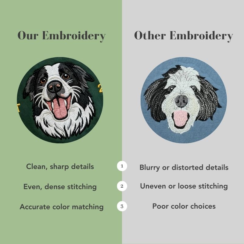 I love this sweater! The embroidery is an exact match to the picture provided. The quality is great! I ordered this sweater after my sweet dog passed, it’s perfect to remember her. Highly highly recommend!
